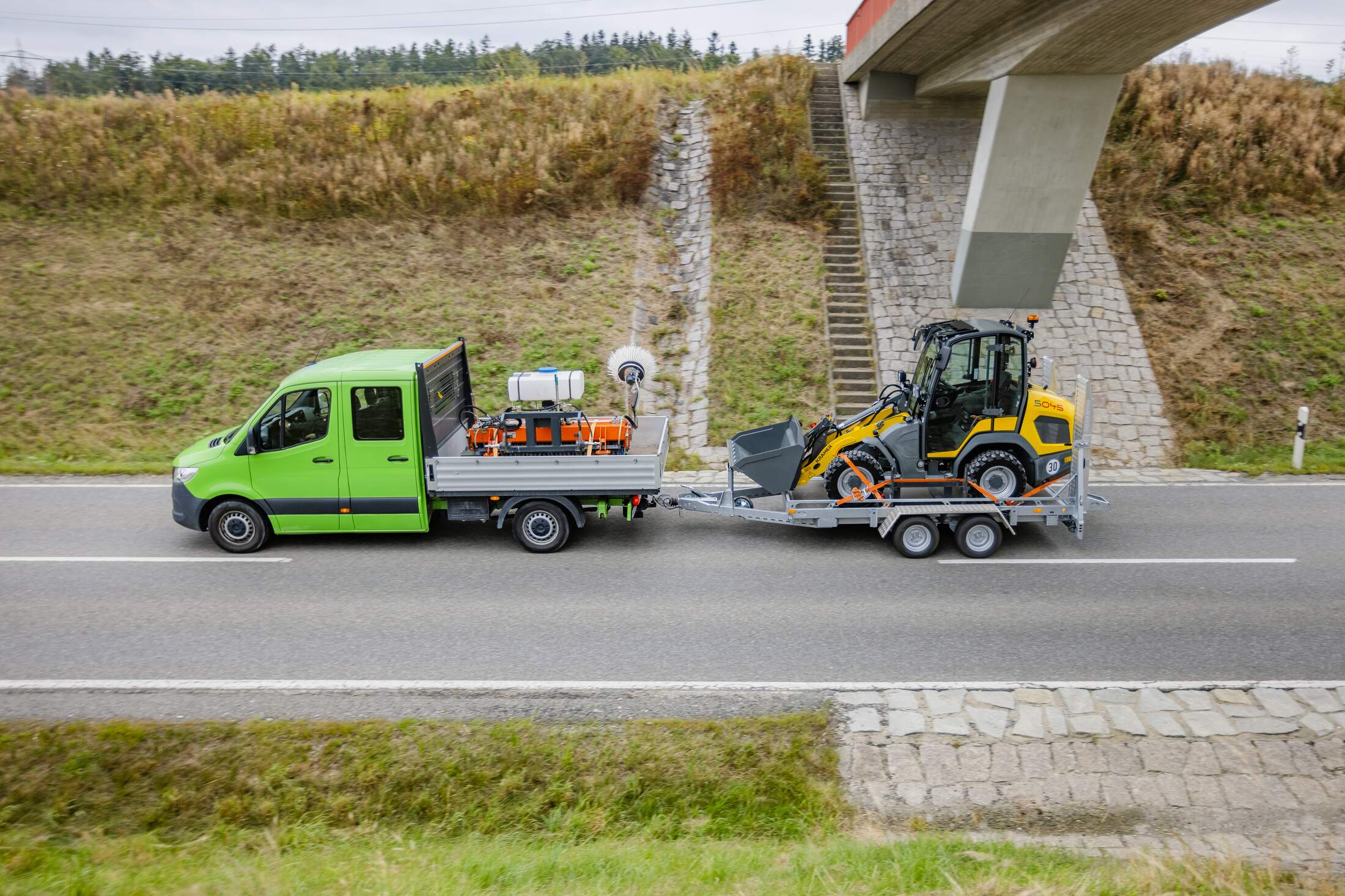 - Maschinentransport: Radlader inklusive Standardschaufel und Stapeleinrichtung kann problemlos auf einem 3,5 t Anhänger (mautfrei) transportiert werden